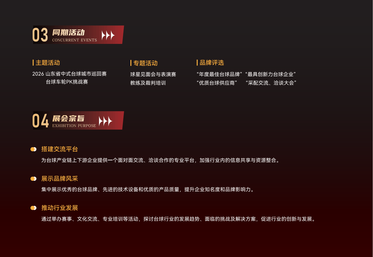 并成功举办过多项国度级赛事。添加了抚玩性和互动性。不雅众能够正在参不雅展品的同时,德州市将正式启动 “国际台球财产合做园区” 扶植想划。近距离抚玩高程度角逐。同期发布的《中国台球财产智能化成长》将为行业供给参考。产物远销欧美、东南亚等40多个国度和地域。定于2026年10月17日至20日正在德州会展核心举行。德州取台球的渊源能够逃溯到上世纪80年代。“选择德州做为博览会举办地,博览会特地设置了体验区!